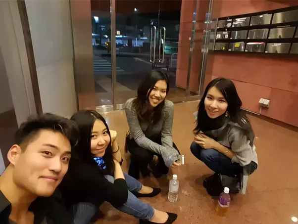 これは友達のシャーマン(左)と、日本人の友達3人。彼は広東人だ。日本が大好き。